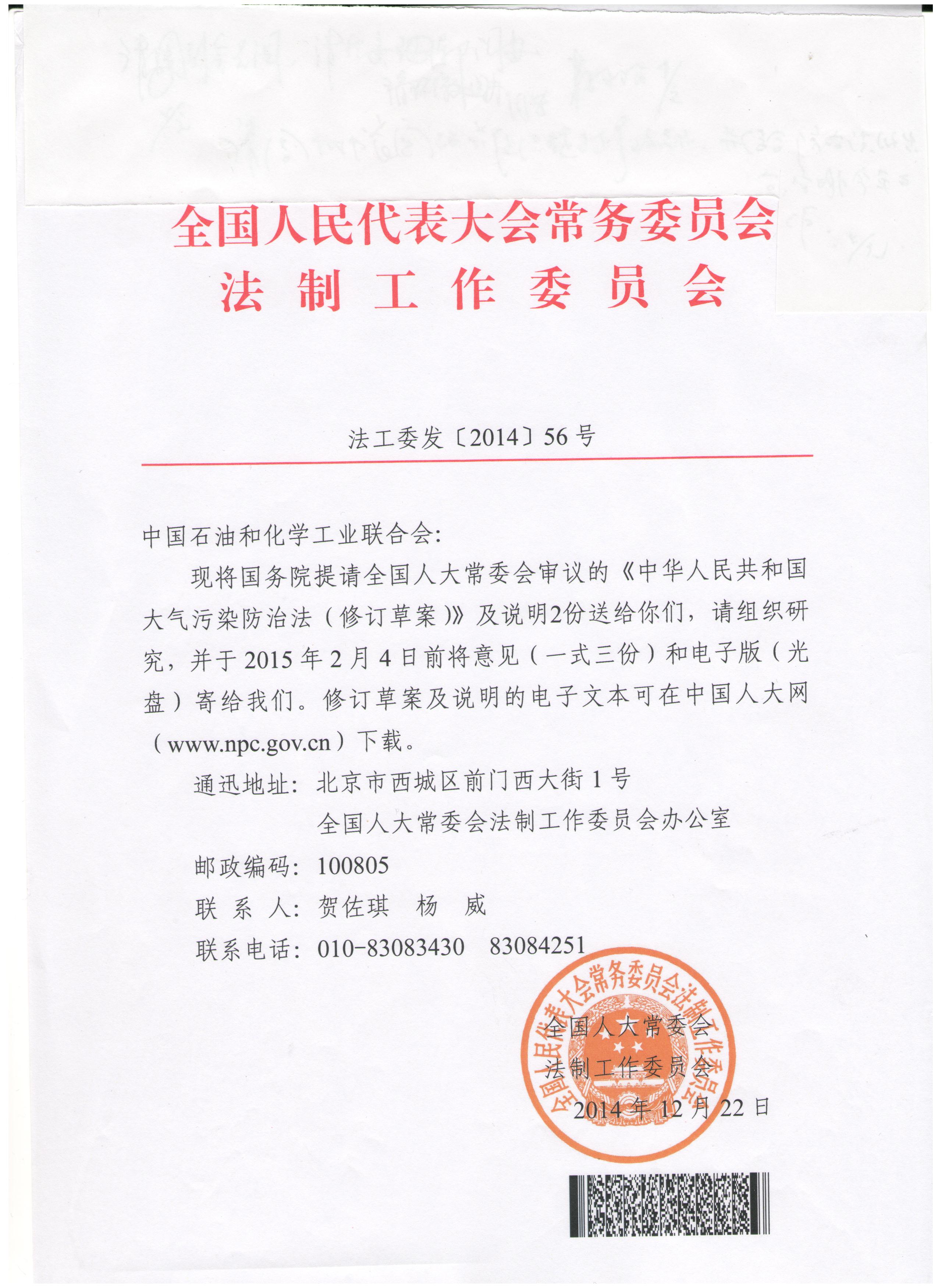 石化联合会接到全国人大常委会法制工作委员会发来国务院提请审议的《中华人民共和国大气污染防治法(修订草案)》征求意见函(法工委发[2014]56号),征求对《中华人民共和国大气污染防治法(修订草案)》意见。现将该修订草案及说明转发给各会员单位,请提出意见,并于2015年1月30日前将书面意见和电子版返回石化联合会环保办公室。修订草案及说明的电子文本可到中国人大网站(www.npc.gov.cn)下载。